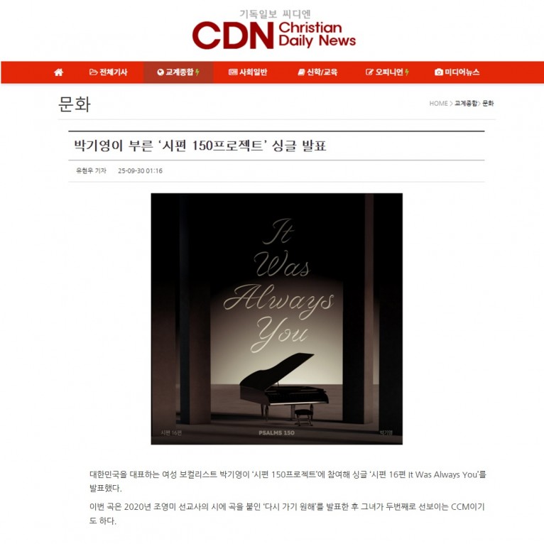 뮤직타임 [기사] 박기영이 부른 ‘시편 150프로젝트’ 싱글 발표(기독일보 씨디엔)