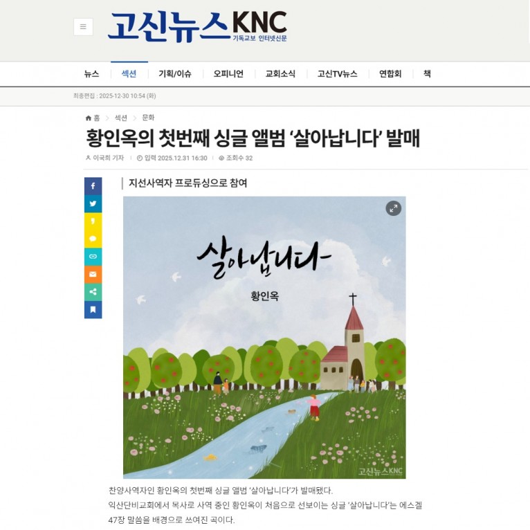 뮤직타임 [기사] 황인옥의 첫번째 싱글 앨범 ‘살아납니다’ 발매(고신뉴스 KNC)