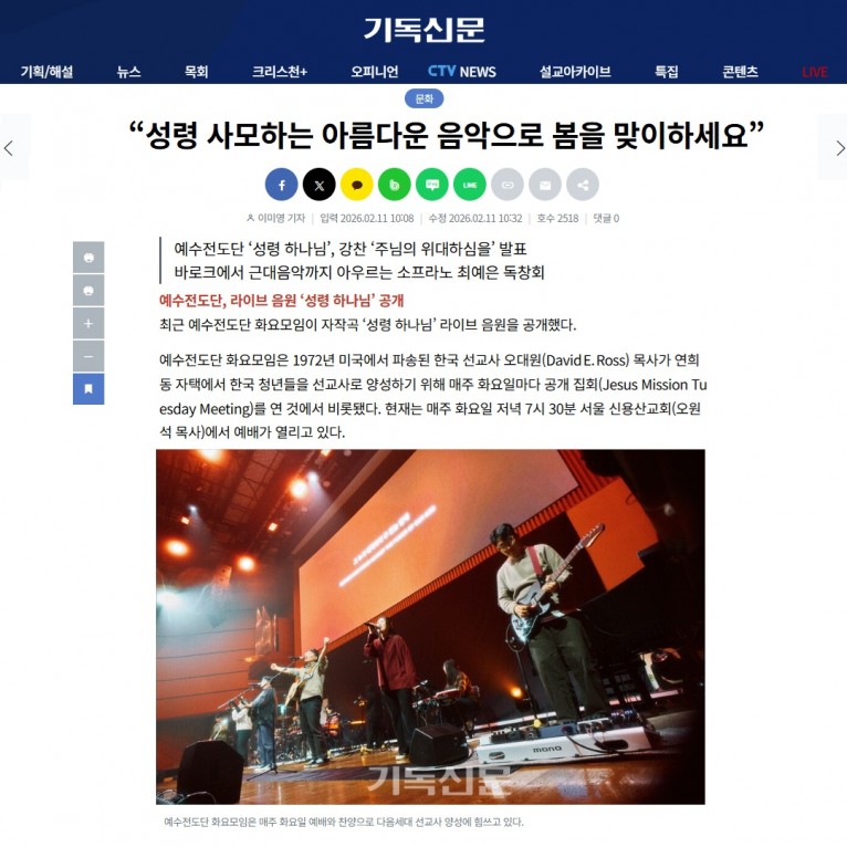 뮤직타임 [기사] “성령 사모하는 아름다운 음악으로 봄을 맞이하세요”(주간기독신문)_예수전도단 화요모임