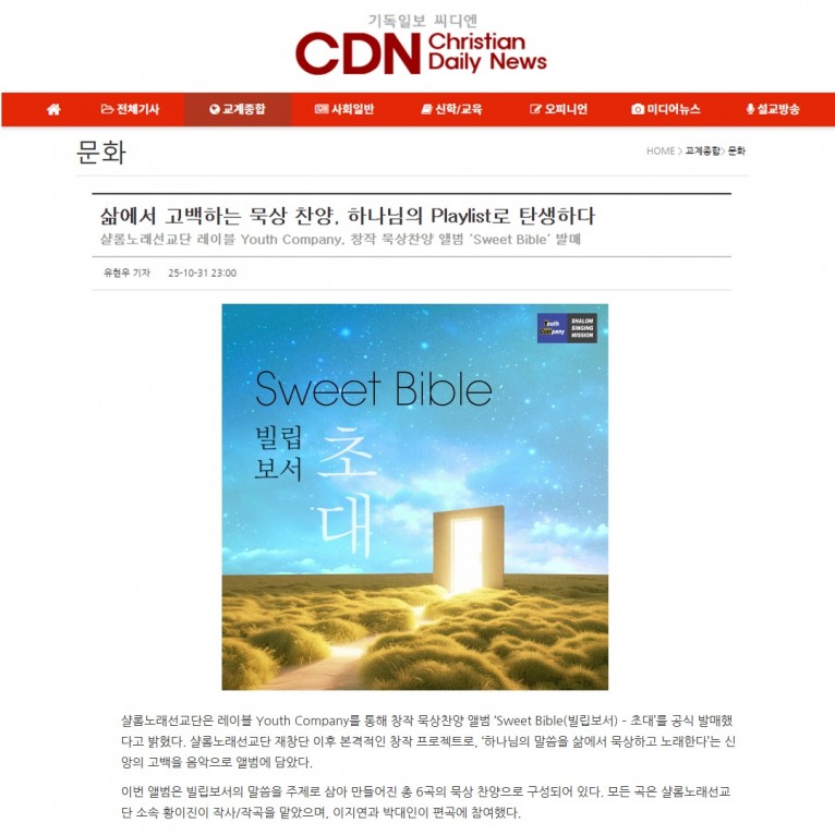 샬롬노래선교단은 레이블 Youth Company를 통해 창작 묵상찬양 앨범 ‘Sweet Bible(빌립보서) – 초대’를 공식 발매했다고 밝혔다. 샬롬노래선교단 재창단 이후 본격적인 창작 프로젝트로, ‘하나님의 말씀을 삶에서 묵상하고 노래한다’는 신앙의 고백을 음악으로 앨범에 담았다.